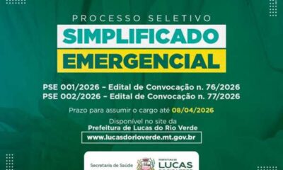 A Prefeitura de Lucas do Rio Verde divulgou nesta segunda-feira (06), dois novos editais de convocação de aprovados, nos Processos Seletivos Emergenciais n. 001/2026 e 002/2026....