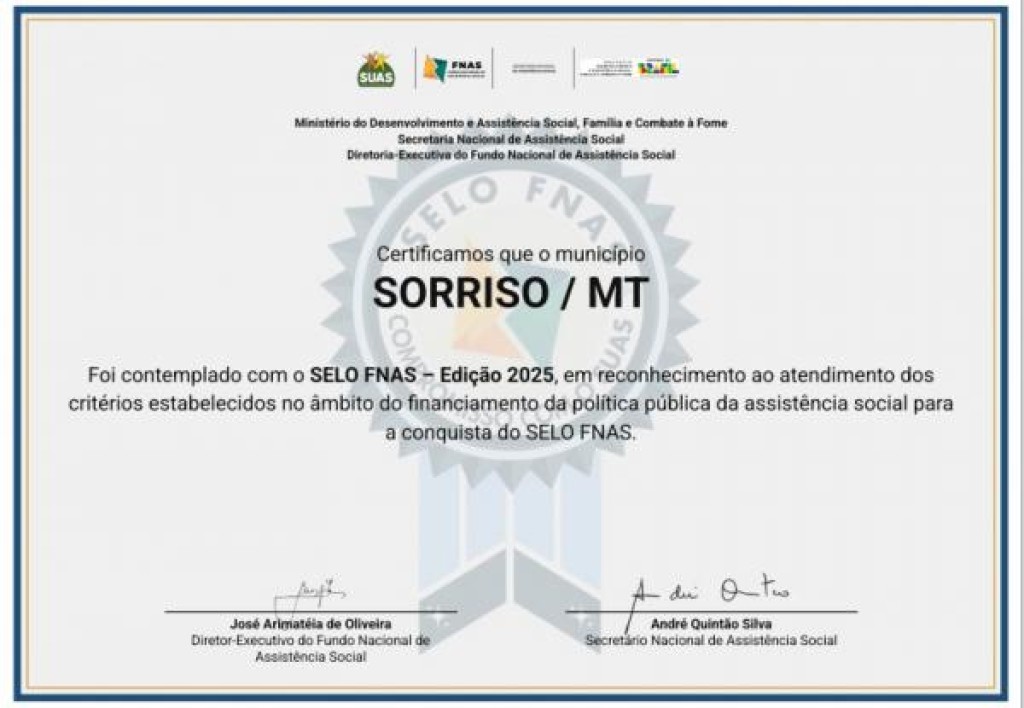 O reconhecimento que a Prefeitura usou, com responsabilidade e eficiência, todos os recursos destinados à área de Assistência Social em 2024. Sorriso recebeu, do Ministério do Desenvolvimento e Assistência Social, Família e Combate à Fome, o Selo FNAS [Fundo Nacional de Assistência Social ] – Edição 2025.